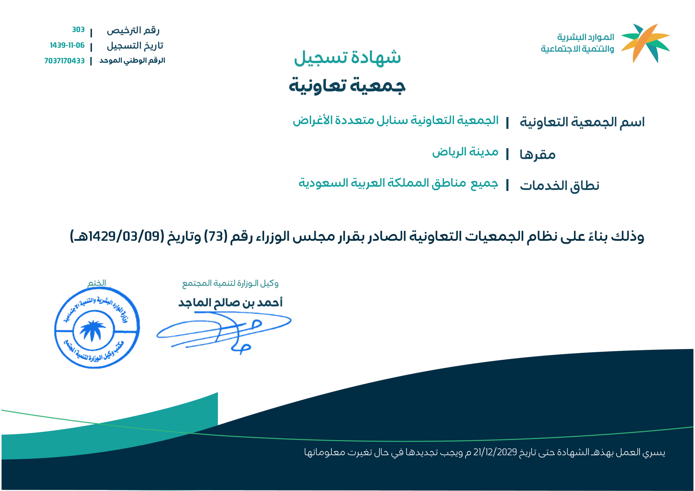 تــــم تاسيس الجمعـــية بموجب نظـــام الجمعـيات التعاونـيه الصـادر بقـرار مجلـس الــوزراء رقــم 73 وتاريـخ 9-3-1429 ومـا يصـدر علـيه مــن تعديـلات ولوائـح تنفيذيـة وبموجب نصـوص أحكـام هـذه اللائحـة وهى (جمعـية تعاونـية متعـددة الاغراض ) رقــــــــــــــــم 303 و تاريـــــــــــــــخ 1439/11/6 هـــ.